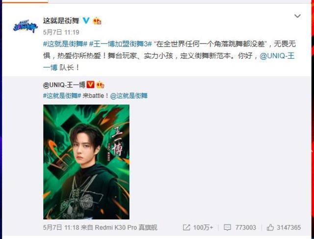 5月5日,《这就是街舞》第三季官宣了第一位队长张艺兴,紧接着第二天又官宣了第二位队长王嘉尔队,而第三天终于官宣了第三位队长,没错,那就是王一博。