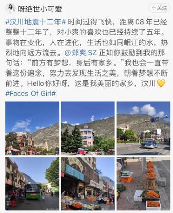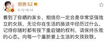这是一个来自汶川的一则帖子,也是来自郑爽粉丝的报平安。在文中,她表达了对郑爽的喜欢,也晒出了如今汶川重建后的美丽照片。而在回应中,郑爽也用她独特的文风,给予粉丝最温暖的支持力挺: