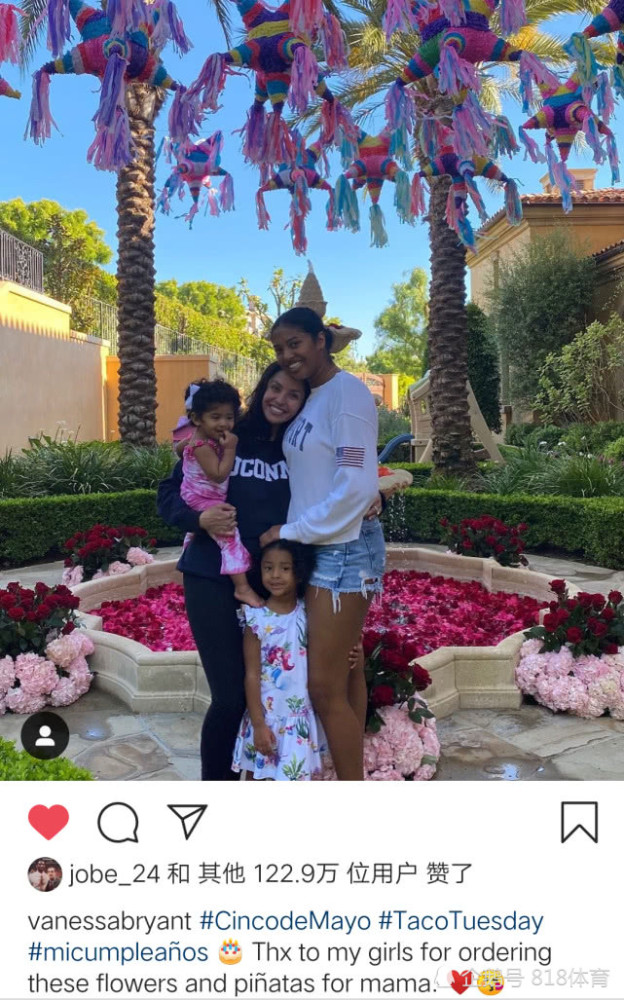 瓦妮莎晒出了和三个女儿在花园中的合影,身后花团锦簇,,写道:“谢谢我的姑娘们为我订的这些花和Pi ata(一种纸糊的容器,其内装满玩具与糖果)。”