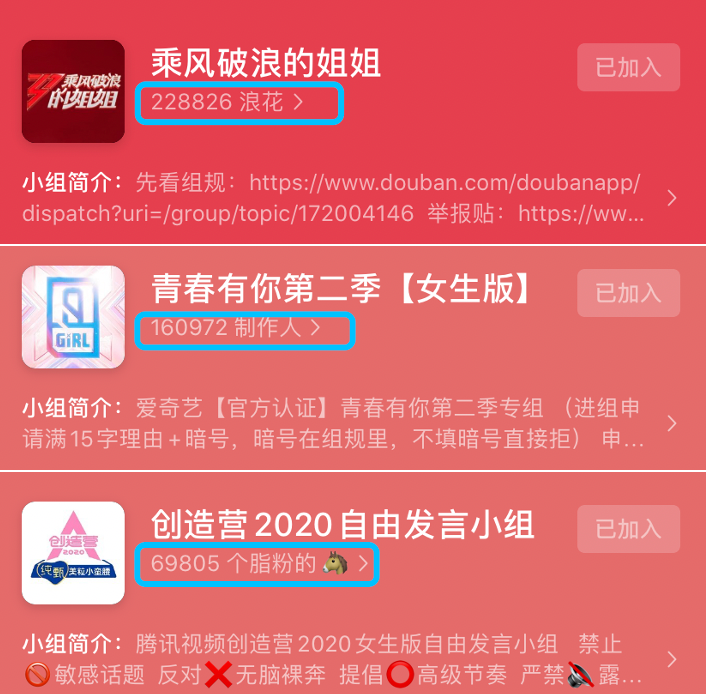 目前,《乘风破浪的姐姐》的豆瓣专组在已经封锁,必须提供暗号才可以进入的情况下,组员人数已达22w+,是《青春有你2》和《创造营2020》组员人数的总和。