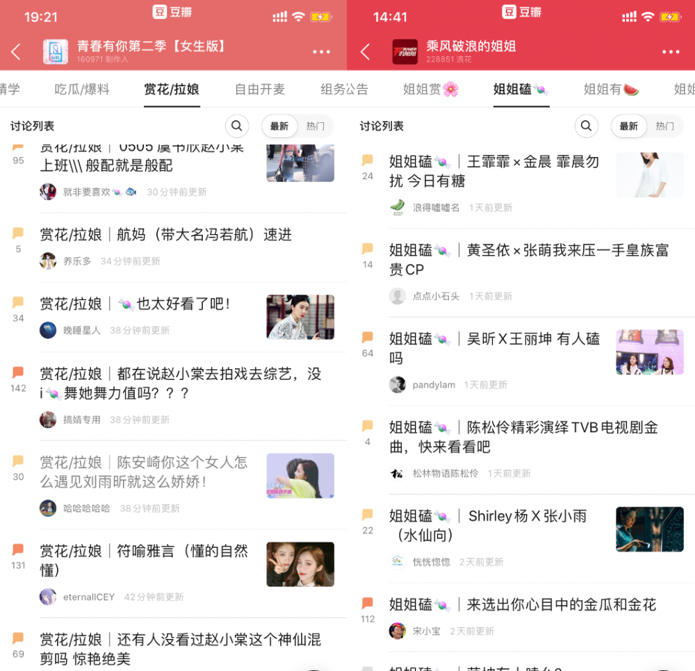 而《乘风破浪的姐姐》《青春有你2》两个节目的专组里,都专门开辟出了一个组CP的栏目,分别叫“姐姐磕糖”和“赏花/拉娘”。