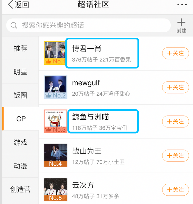 高人气的角色CP甚至延展到生活中,博君一肖、鲸鱼与洲喵等真人CP让粉丝们磕得不亦乐乎,至今仍在微博超话CP榜单的前三名。