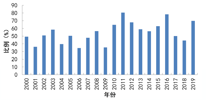 舵★浠惧冲奖ョ锛2019骞村ㄥ芥璞$惧冲规琚跨褰卞讳杞汇朵腑锛ㄥ芥琚烘卞哄㈢Н姣渚杈69.9%锛涓2000骞翠互ョ涓楂锛2019骞存5涓伴婚斤杈甯稿勾灏2.2涓锛伴婚寮哄害翠寮