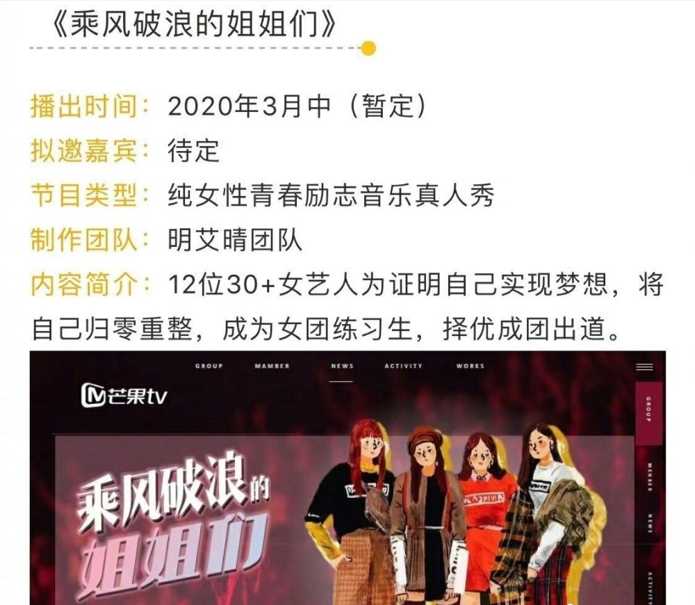 据悉整个节目核心理念和韩国综艺《姐姐们的Slam Dunk》如出一辙,均是大龄女艺人的圆梦选秀,最后成团重新出道引来新面孔。