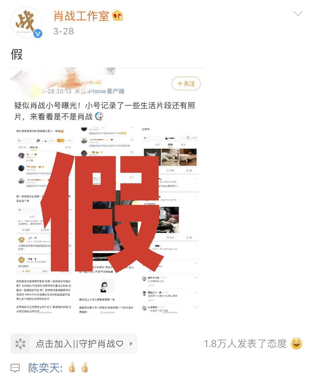 肖战打假陈奕天点赞这是怎么回事?陈奕天肖战什么关系?近日,肖战工作室打假疑似肖战小号曝光!小号记录了一些生活片段还有照片,来看看是不是肖战,工作室发声明一个简明的字假!干脆利落,肖战随着人气上升黑粉也是越来越多,大家也都知道,许多人利用明星头衔在外面博取关注度,所以认准认证过的账号尤为重要,而陈奕天也是在下面大大竖了两个大拇指,貌似说真打假打得真好,要给赞。