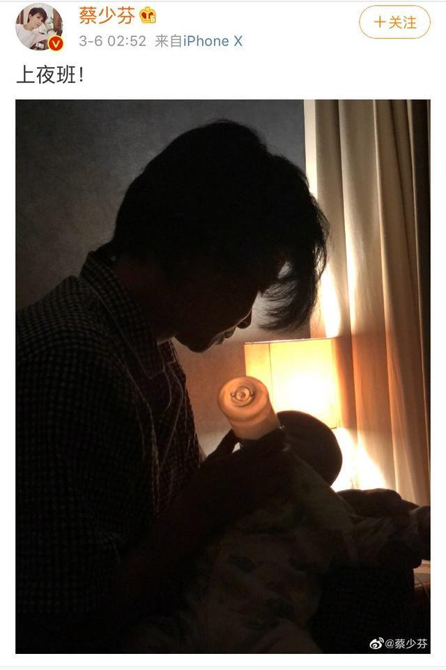 前段时间,蔡少芬在微博晒了一张照片,是丈夫张晋深夜喂奶的样子。