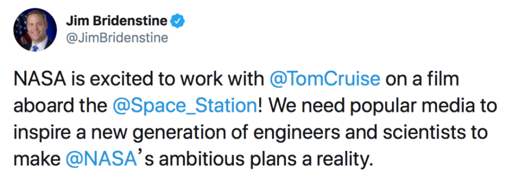 消息得到美国国家航空暨太空总署(NASA)署长布莱登斯坦的证实,他5日在推特发文,兴奋地表示NASA要与这位好莱坞巨星联手登陆国际空间站!但他并没有透露更多计划内容和双方的合作细节。