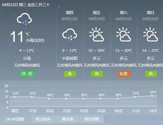 4月22日空气质量等级优或良,AQI指数30~60,首要污染物O3。