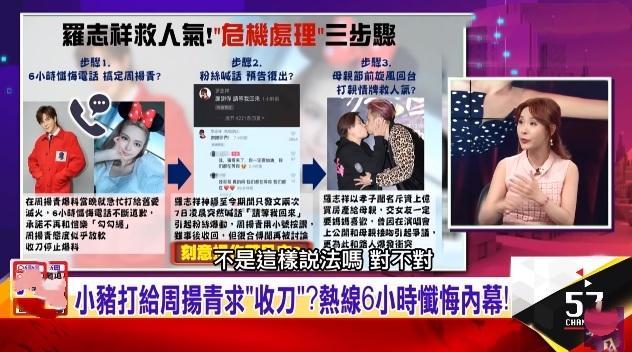 据悉某台媒分析罗志祥处理桃色危机的三大步骤,表示:这个策略非常成功。主持人表示,第一招便是“与周扬青通电话,积极忏悔,长聊6小时”,让周扬青开始心软,并使其收手不再继续爆料。