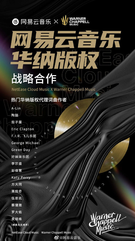 5月12日,网易云音乐宣布与华纳版权(WCM)达成战略合作。双方将在曲库内容、在线K歌、音乐IP开发等音乐产业上下游领域展开全方位合作。其中,网易云音乐将获得华纳版权旗下音乐作品词曲版权之授权使用。