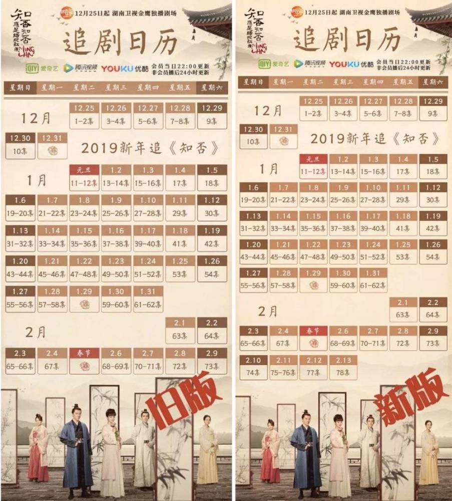 文娱商业观察收集了两张《知否》开播前和开播后发出的追剧日历,仔细比对两版日程进度,不难发现其中的奥秘。