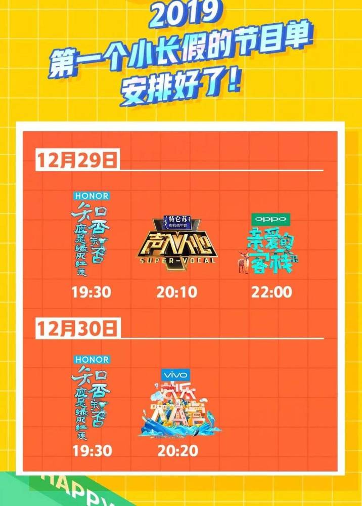 在部分节庆日时,湖南卫视会根据假期安排,调整自家节目播出时间。今年元旦时,由于国家法定节假日为周日、周一、周二,为此湖南台开拓创新,调整出特别编排,让周五晚间节目顺延至周六晚间,周六顺延至周日,以至于当晚不少网友感到疑惑,《快乐大本营》怎么变成周日播出。
