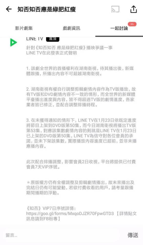 此前,《知否》在中国台湾地区的独家视频网站播出方line TV播出时,由于播出进度超前,被湖南卫视进行警告。当时,line TV特意发出正式声明,声明中写道,该剧全世界的首播权利在湖南卫视,待其播出后,新媒体跟播,所播出内容不可超越湖南卫视,且湖南卫视有权自行调整剪辑剧情内容,作为TV版播放。