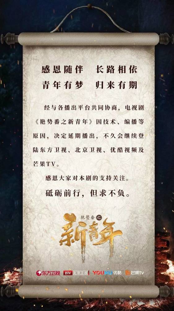 上个月,由易烊千玺、黄子韬主演的电视剧《艳势番之新青年》定档1月30日在东方卫视和北京卫视播出,后由于技术原因,延档至2月6日,造成两大卫视剧场断档5天,平台方不忍,后决定延期播出。