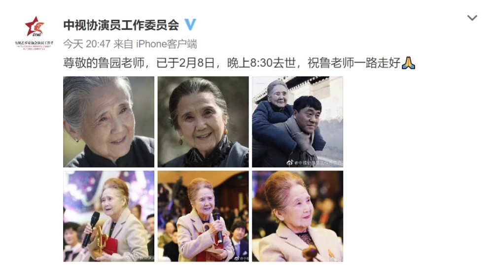2月12日,中视协演员工作委员会发布讣告,曾在电视剧《情满四合院》中饰演聋老太太的演员鲁园于2月8日晚去世,享年91岁。