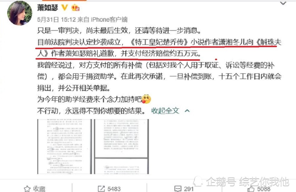 不过《楚乔传》这部电视剧其实也可以说是一部抄袭作品,而且抄袭的就是小说《斛珠夫人》,因为小说《11处特工王妃》中有一部分的内容和《斛珠夫人》相似,而且《斛珠夫人》的作者萧如瑟已经上诉,并且在一审的时候已经胜诉,《11处特工王妃》的作者潇湘冬儿被判赔偿经济损失5000元,并且道歉。