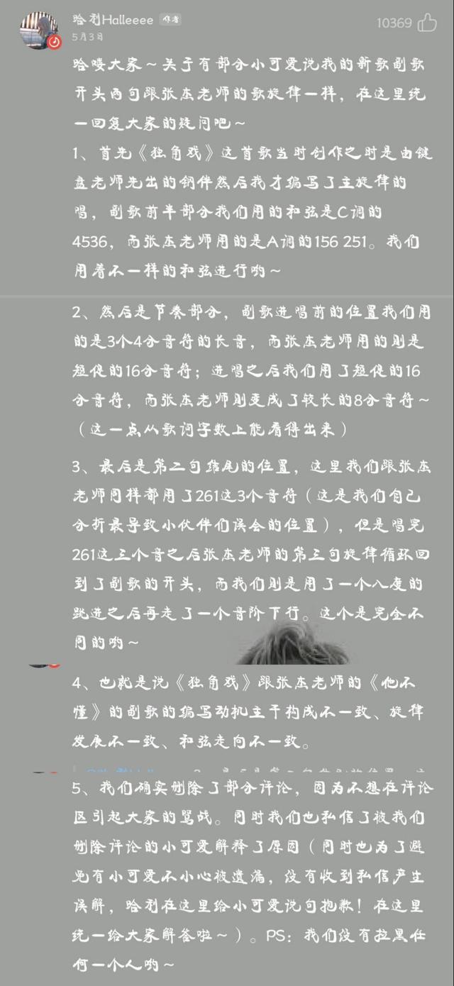 为此,《独角戏》所谓的创作者对于网友对他抄袭这件事,也进行了回应。对于长篇大论的回应,我做了简单解析:1、独角戏的副歌与《他不懂》和弦不一致;2、音符、旋律等地方与张杰的歌也是存在着很大的差异;3、直接表明自己没有抄袭,拒绝骂战。