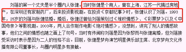 张健因为转行投资大量影视剧,爆料说他投资《京都纪事》时和刘蓓相识,就结婚了。