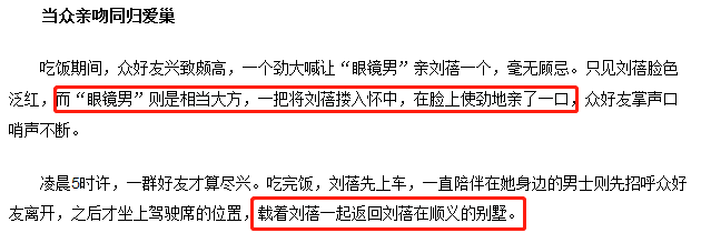 当时有媒体拍到,刘蓓在朋友聚会上,和一个男子亲亲抱抱,两人吃完饭后还一起回了别墅。