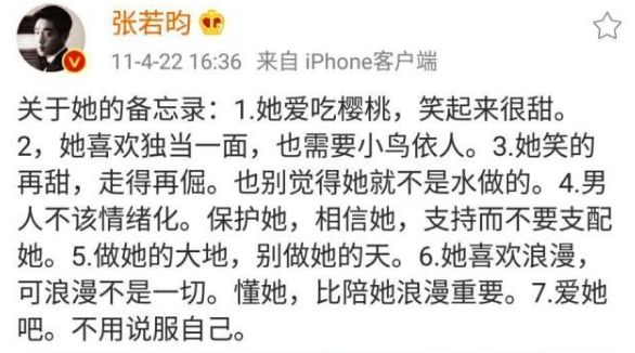 他和他爸完全不一样,张若昀要长情的多,他和8年前那个爱吃樱桃,写在备忘录里的女孩结婚了。