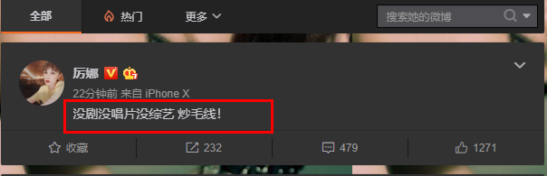 5月7日,厉娜发文否认炒作,没剧没唱片没综艺,炒毛线!