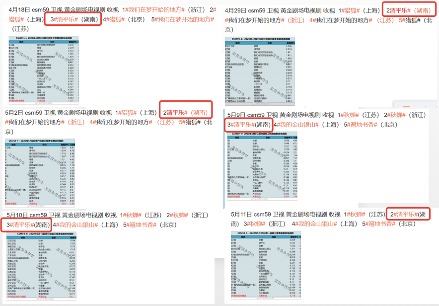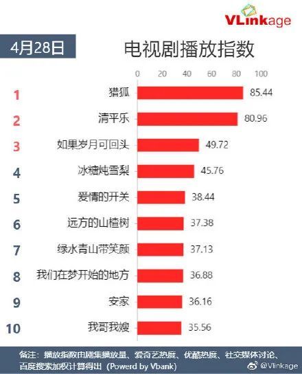 同时,根据Vlinkage榜单显示,从4月18日起,在电视播放指数这一维度,《猎狐》反超《清平乐》。此外,在《猎狐》收官之后,《清平乐》却也未能坚守收视第一位的宝座,反而由接档《猎狐》的谍战剧《秋蝉》获得。综合《清平乐》整体收视率来说,它是真正意义上高开低走的剧集,难以复刻《琅琊榜》的收视、口碑路径。