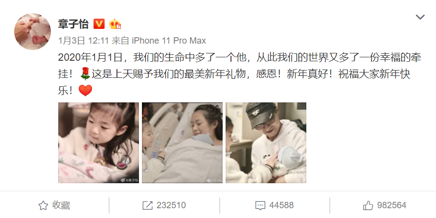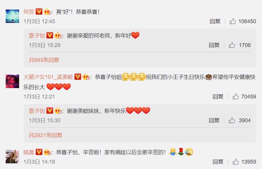 1月3日,章子怡发布了自己的婴儿照片和第二个孩子。是个男孩,后来,汪峰给妻子章子怡发了一封感谢信。王力宏、姚晨、秦海璐、何炅等演艺圈明星都在评论区写下了祝福。