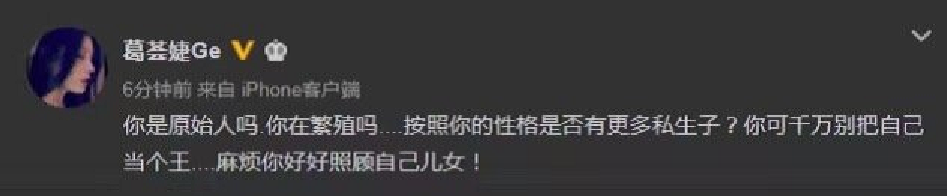 当时媒体报道章子怡怀孕后,汪峰前妻葛荟婕说:“你是原始人吗?你在繁殖吗?麻烦你好好照顾自己儿女!这是对汪峰的讽刺。也冒犯了章子怡,不得不说,这嘴也是真毒。女人疯起来真可怕!