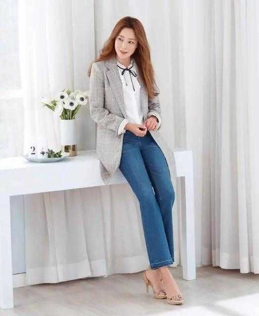 这套搭配,她上身穿温柔的灰色格纹西装搭配白色蕾丝衬衫以及微喇牛仔裤,设计感十足!特别是这件白色蕾丝衬衫优雅中又不失俏皮,优雅度百分百,而且九分微喇牛仔裤真的十分修饰腿型,掩盖腿部线条不足。同时灰色本身就是十分优雅的颜色,再配上格纹元素,职业女性的风范与十足的女神范被展现的淋漓尽致!