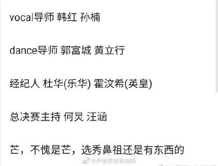 导师方面,vocal有韩红和孙楠,dance有郭富城和黄立行,经纪人分别是杜华和霍汶希两大王牌推手,总决赛主持是何炅汪涵两大台柱子担纲,听着阵容就觉得够带感。
