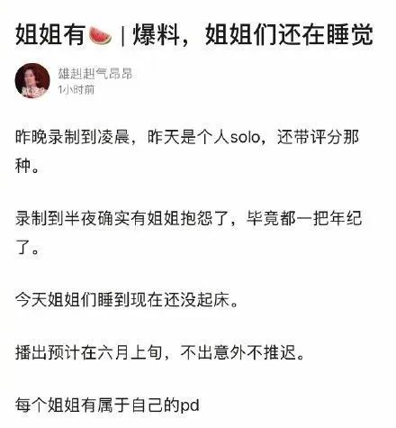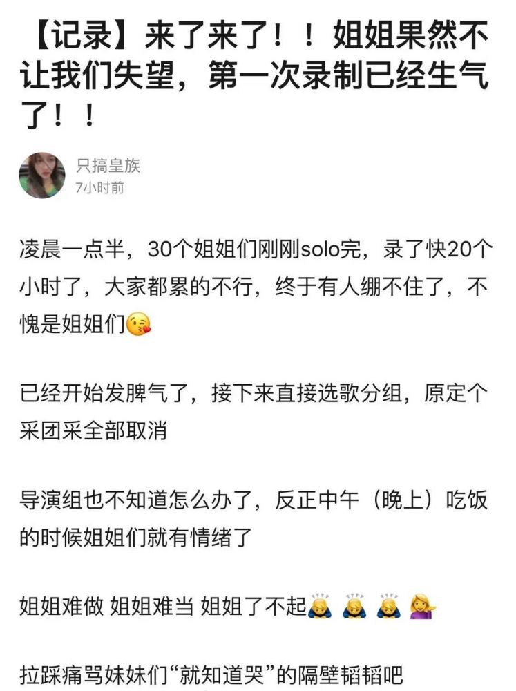 另外目前释放出的一些信息就已经加重了火药味。比如第一次录制录了20个小时,有好多姐姐已经发飙了。