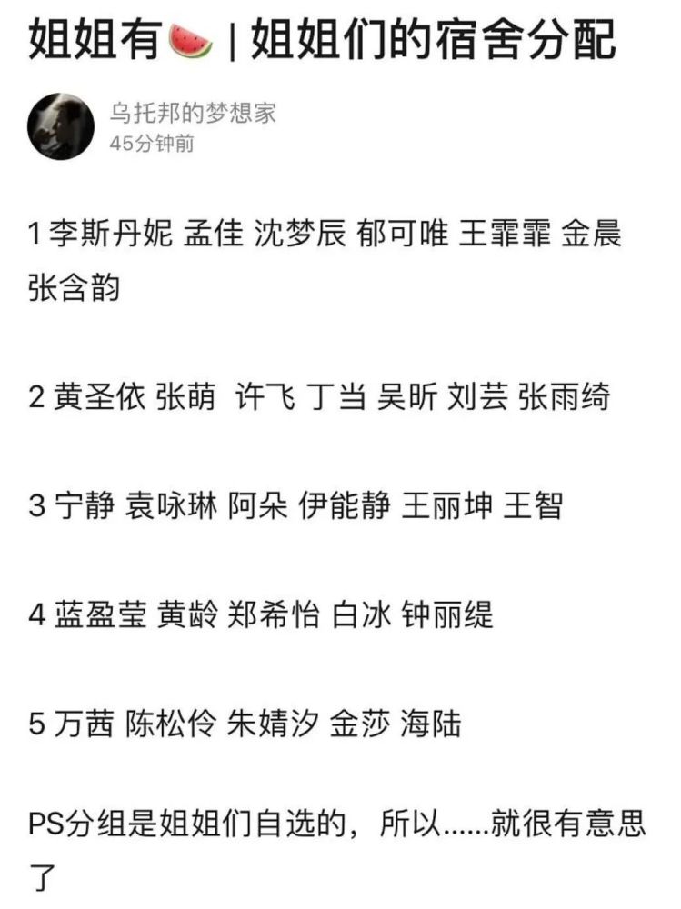 宿舍的分配也做好了,注意这样的组合都是大家自己选的,姐姐们的亲疏远近就显而易见了。