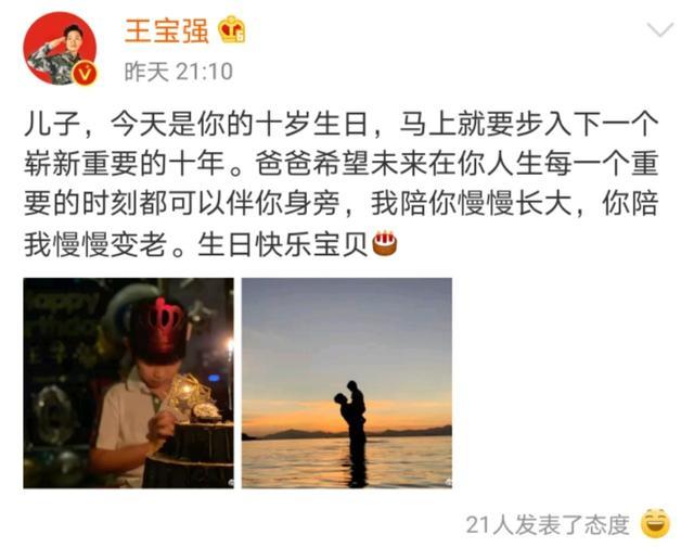 马蓉和王宝强的婚姻一拍两散,但是因为孩子的存在,身为父母也难免仍有交集。5月11日晚,王宝强和马蓉先后在社交平台上发文为儿子王子豪庆祝生日,王宝强不仅放出了与儿子温馨互动的照片,而且还深情配文:“我陪你慢慢长大,你陪我慢慢变老。”