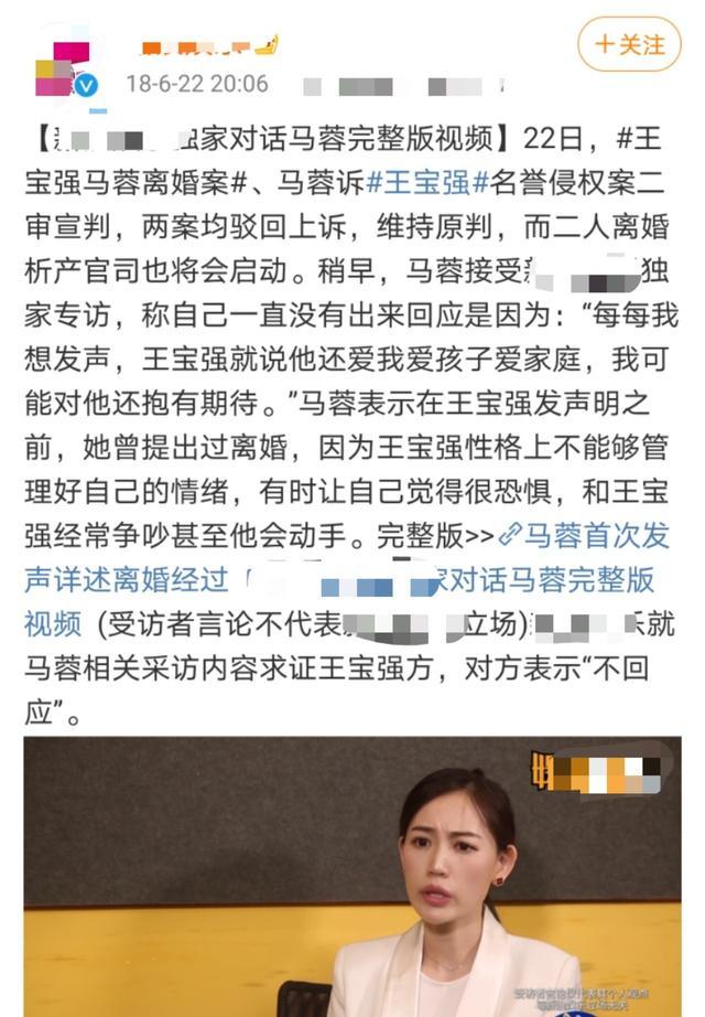 王宝强如今除了宣传几乎不再发布新动态,而马蓉的个人社交平台却仍然置顶着她自己详述离婚经过的采访。甚至在王宝强新恋情曝光时在自己的小号出言讽刺。