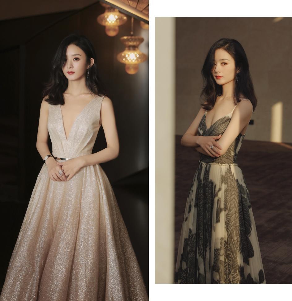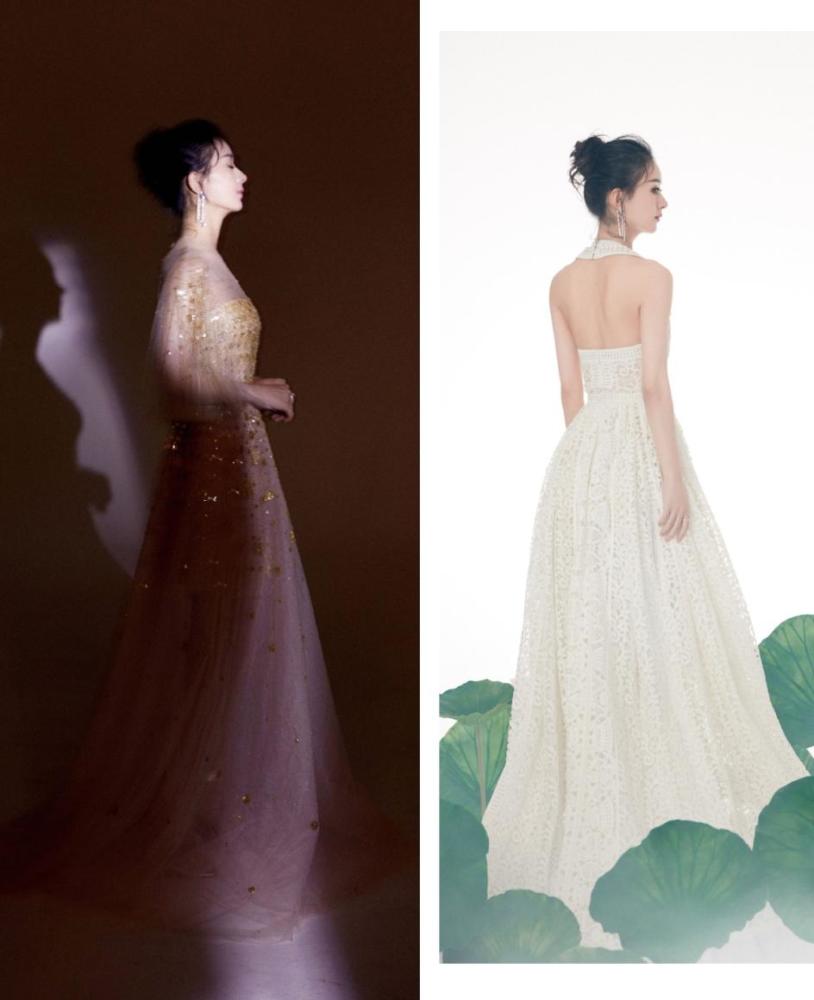 明星慈善夜的两套Look,仙女裙+丸子头,温柔婉约,美若不食人间烟火的仙子。