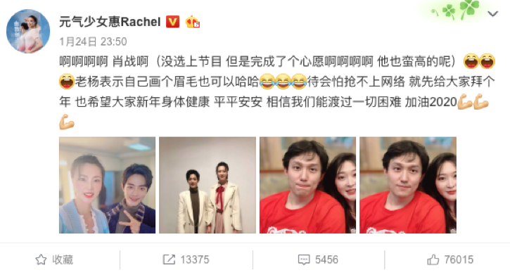 当然,除了羡慕谢娜之外,还有一位女生让人羡慕,因为她跟肖战合影了!这位女生叫惠若琪,她在自己的个人社交平台上发了自己和肖战的合影,照片中惠若琪穿着蓝色的毛衣对着镜头微笑,而肖战在镜头后也笑得很甜,还对着镜头比耶,哥哥太帅啦!