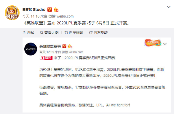 今日,英雄联盟赛事官方通过微博宣布,LPL夏季赛将于6月5日正式开赛, 以下为原文: