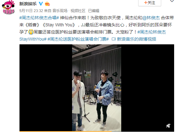 根据新浪娱乐昨晚报道,为了致敬在疫情中献身与拼搏的白衣天使们,周杰伦与林俊杰二人合力献歌了《稻香》、《Stay With You》。