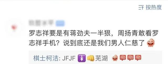 就是这样的“流氓”逻辑,柯洁不仅点了赞,还用夹带emoji的语言回复了“JFJF(劲夫劲夫),女权芜湖(呜呼)”。