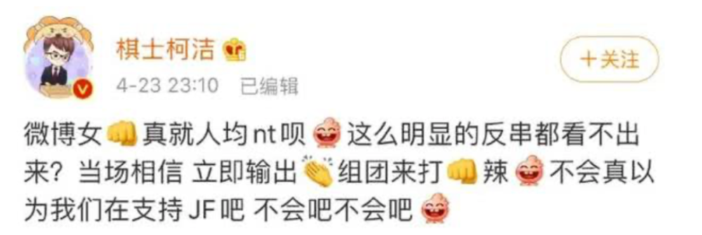 眼看事情闹大,柯洁再次回复:“微博真就人均nt(脑瘫)呗,这么明显的反讽不会看不出来吧?”