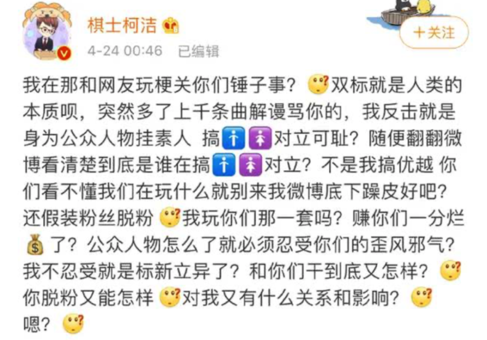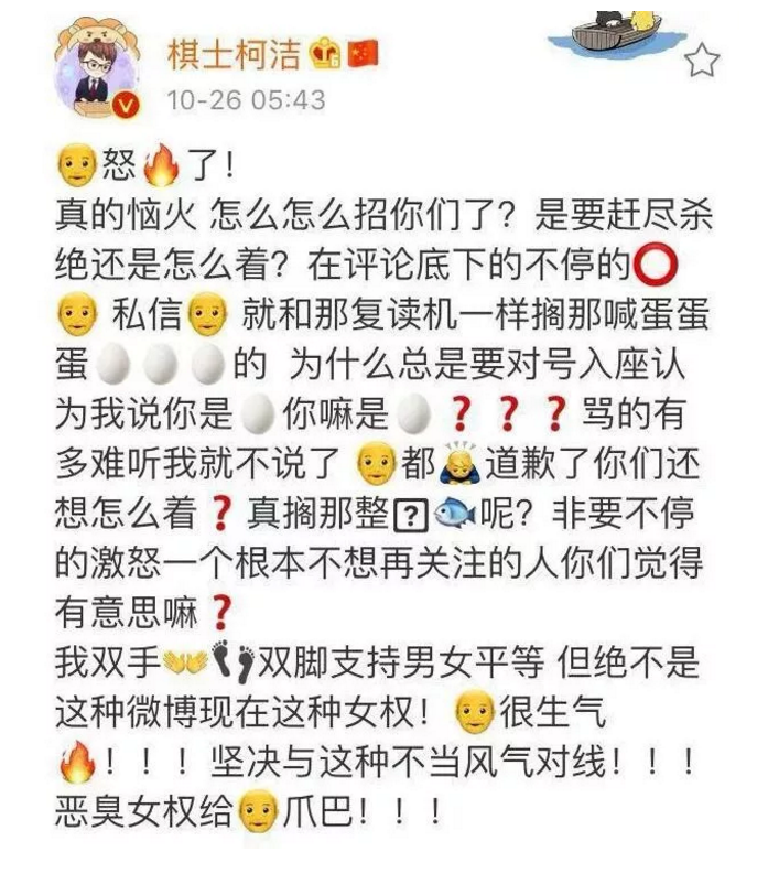 从此,柯洁和“女权”结下了梁子,不断吐槽与女性相关的话题。