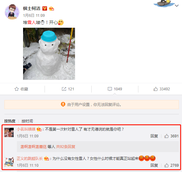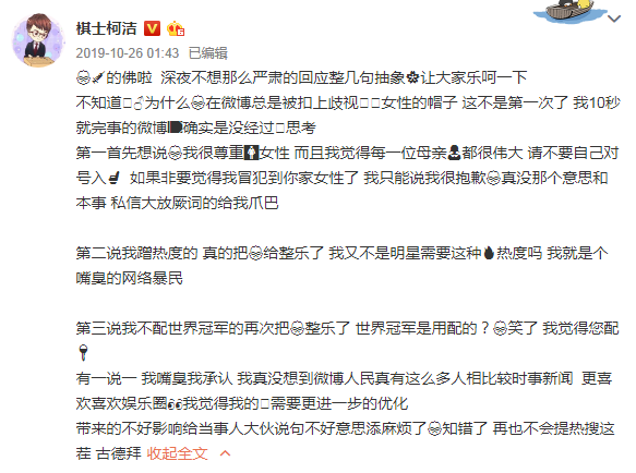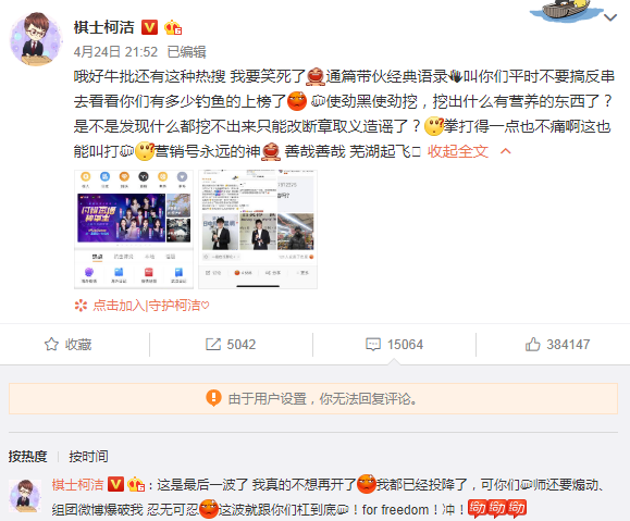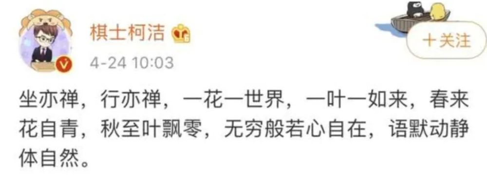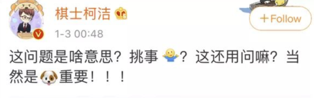 甚至柯洁发一条毫不相关的状态,微博下面也会充斥着嘲讽的言论……