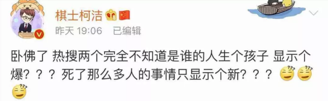 在周扬青与罗志祥分手一事引爆全网的时候,吃瓜群众柯洁也忍不住抖了个机灵,在微博上抛出了自己的“不懂就问”系列。