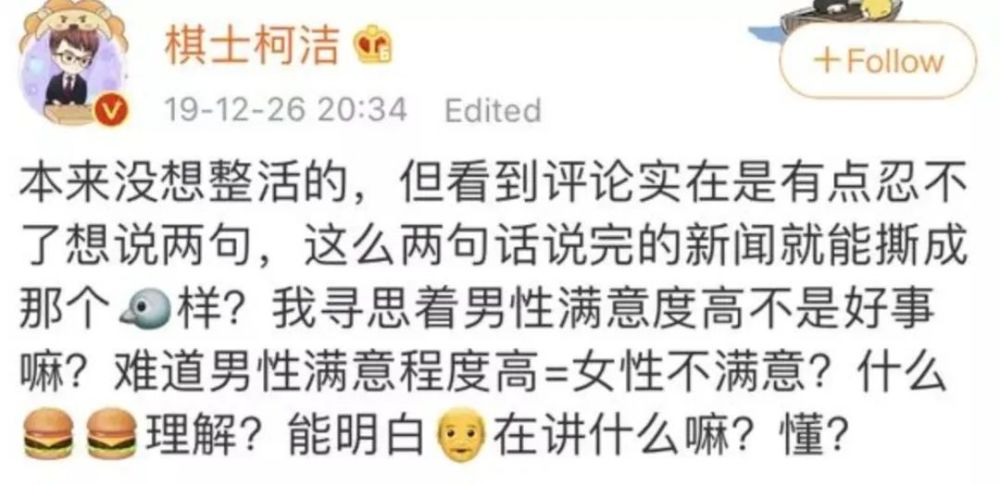 2019年12月26日,柯洁转发了《中国男性婚姻满意度高于女性》的文章并写道:“看到评论实在是有点忍不了想说两句,这么两句话说完的新闻就能撕成那个样?我寻思着男性满意度高不是好事嘛?难道男性满意程度高=女性不满意?”
