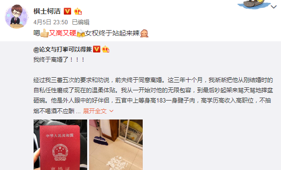 这位曾用网名“论文与打拳可以兼得”“写论文使我快乐_今天写论文了吗”的学姐,自称嫁给了一个年龄大一些的事业有成的老公,但现在,她一定要求孩子改成女方的姓氏,在未得到允许后,她坚持离婚,不要孩子和婚姻,情愿单身生活。对此,柯洁不断发文暗讽。