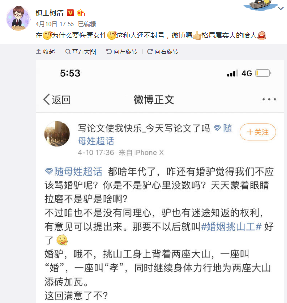 去年10月24日,在“奚梦瑶生子”的话题力压“英国货车发现39具尸体”的新闻,霸占微博热搜第一的时候,柯洁发微博怒斥奚梦瑶“下蛋”都比人命重要(后修改措辞)。这样涉嫌侮辱性的词汇,马上遭到了女权主义者的轮番炮轰。