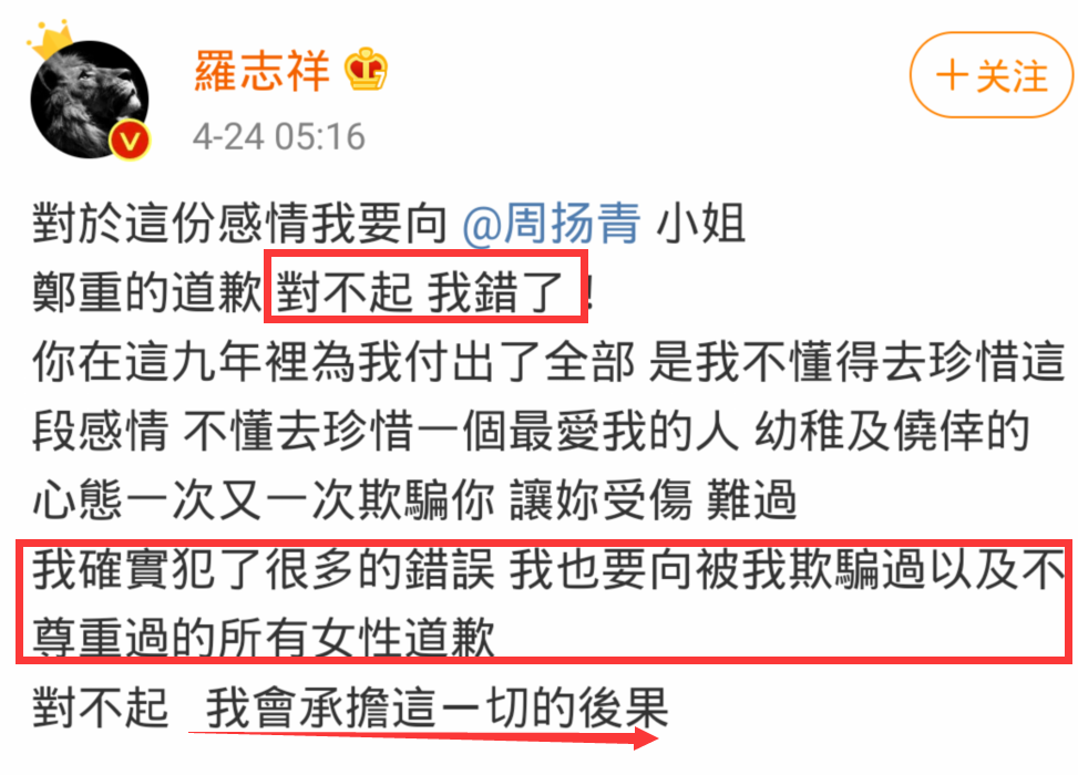 继罗志祥第一条不痛不痒的微博回应后,罗志祥凌晨5点再发微博道歉,只是相比第一条不承认不否认的言论,罗志祥第二次道歉态度异常诚恳。在发文中,罗罗志祥不仅公开向周扬青道歉,还提到了被他“辜负”的其他女性,喊话会承担一切后果,堪称娱乐圈道歉文范本。
