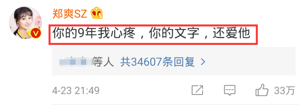 于是,在周扬青“爆料”微博下,郑爽直接用大号评论“你的9年我心疼,你的文字,还爱他”14个字。同是情路不顺,同样是为感情付出了很多的女生,郑爽声援一下周扬青是情理之中,但却被部分网友解读成落井下石,认为郑爽说周扬青还爱罗志祥很膈应人。