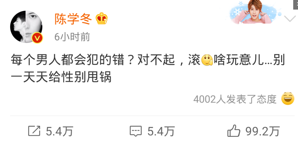 但站在一个吃瓜群众的角度看,郑爽这句话明显是在暗示周扬青迟迟不放实锤,是故意对罗志祥手下留情。除了郑爽外,在罗志祥好友色痞公开diss周扬青后,陈学冬也意难平用大号发声,直指“罗志祥犯了所有男人都会犯的错”是无稽之谈,一句“男人怎么你了,你要这样诋毁男人”,足以感觉到陈学冬内心的愤怒。