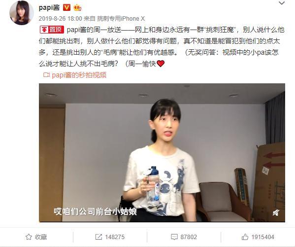 对此papi酱将之前拍的一个视频置顶,视频主题为"网上和身边永远有一群挑刺狂魔",作为对此事的回应。